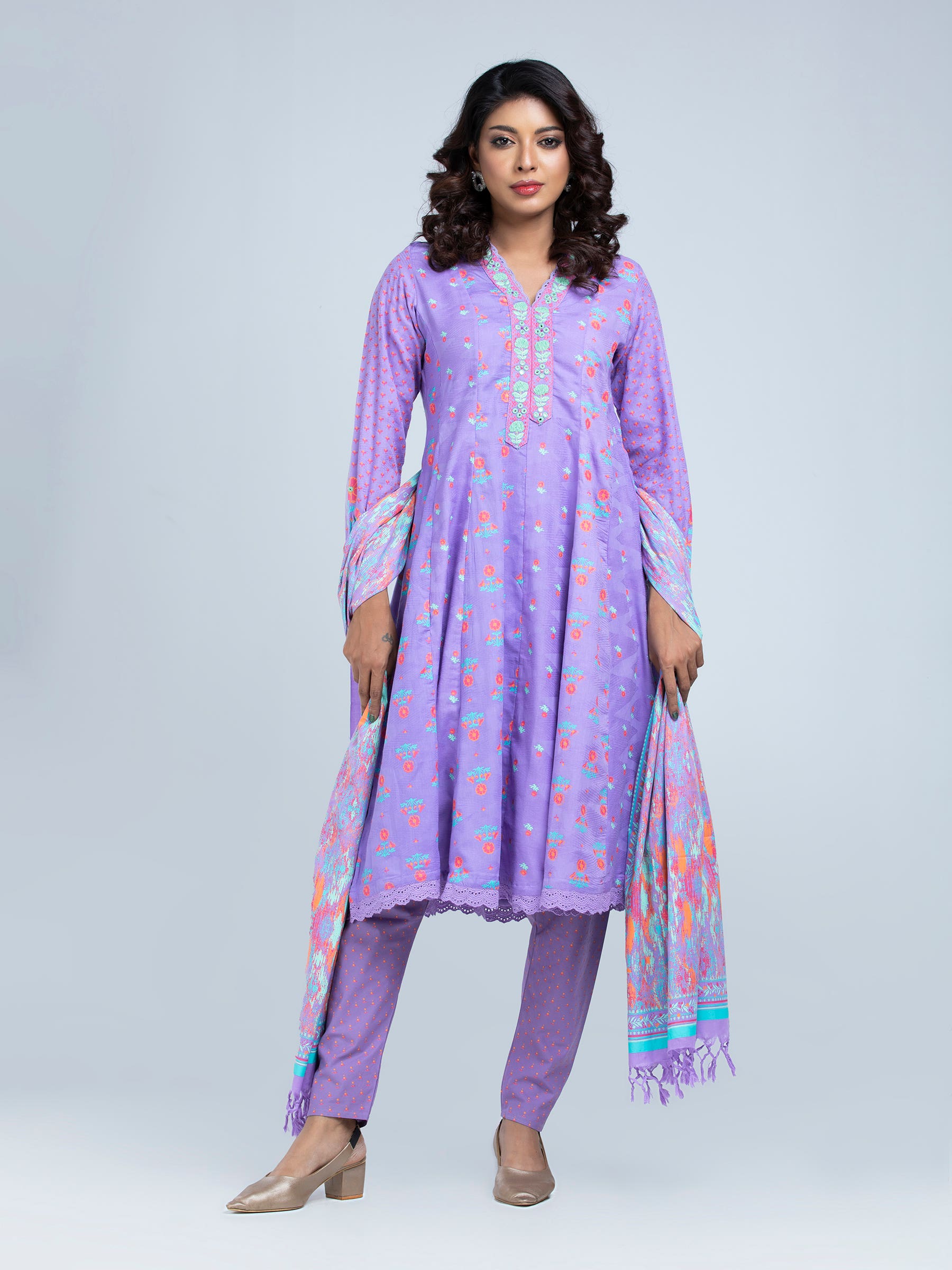 Periwinkle cotton kameez with multicolour prints and green embroidery. Comes with matching printed cotton shalwar and printed cotton dupatta.